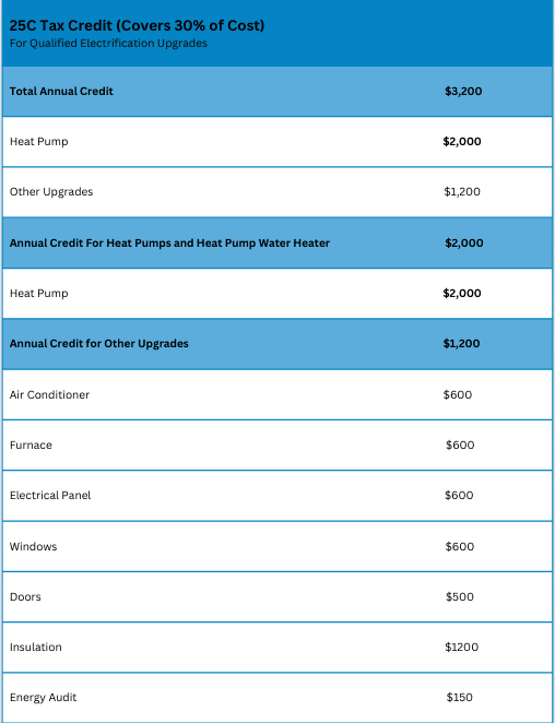 A tax credit is money that will be given back to customers when they file their taxes. Families can earn up to $3200 in tax credits with the 25C tax credit every year. Conversely, a rebate is an off-the-top discount at point of sale and will provide customers with upfront savings. Rebates will not be available until end of 2023 or the beginning of 2024.